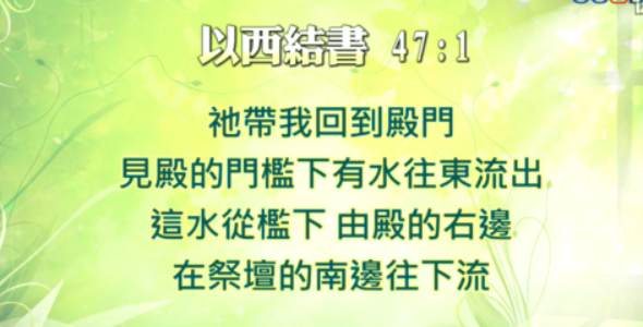 以西结书 47:1 他带我回到殿门,见殿的门槛下有水往东流出(原来殿面朝东)。这水从槛下,由殿的右边,在祭坛的南边往下流。