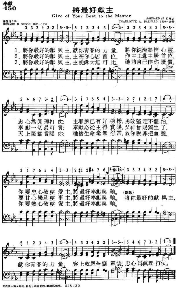 词/Howard B.Grose 曲/Charlotte A.Barnard 歌词: 将你最好的献与主,献你青春的力量, 将你纯洁热情心灵,忠心为真理打仗; 主耶稣已有好榜样,勇敢坚定不惧怕, 你要忠心敬虔爱主,将最好奉献与他。 将你最好的献与主,主在你心居首位, 作主工尊主居首位,奉献一切最可贵; 奉献必从主得赏赐,父神曾赐独生子, 要甘心乐意虔事主,将最好奉献与他。 将你最好的献与主,主爱伟大无可比, 他将自己作你赎价,天上荣耀赏赐你; 他舍生命毫无怨言,救你脱罪把血洒, 你要热心敬虔爱主,将最好奉献与他。 副歌: 将你最好的献与主,献你青春的力量, 穿上救恩全副军装,忠心为真理打仗。 诗歌背景资料: 这首诗的作者古路司(Howard B. Grose, 1851-1939)出生在美国纽约州。 他毕业于罗契斯特大学,曾在纽约州和宾州的第一浸信会牧会多年。 嗣后,他出任南达科塔大学校长,及在芝加哥大学教历史,1910年被聘为浸信会杂志《使命》(Missions)的编辑。 古路司是基督徒热心爱主运动(Christian Endeavor Movement)的领导者之一。 本诗歌的作曲者巴纳德(Charlotte Allington Barnard, 1830-1869),英国人,是英国皇家音乐院的高材生。 她在婚后开始作曲,曾以Claribel的笔名出版了一百多首叙事曲,流行一时。 她谱的圣诗最有名的是本诗歌及《慈悲牧人歌》(Jesus, Tender Shepherd, Hear Me)。 她作的钢琴曲 Come Back to Erin 流传迄今未衰。 另外她尚有两本诗集。